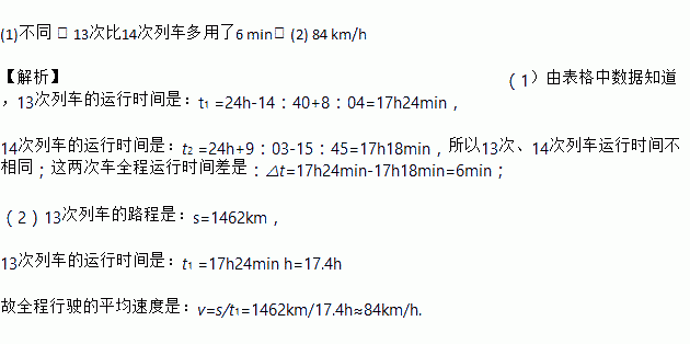 (1)不同 ; 13次比14次列车多用了6 min; (2) 84 km/h 【解析】(1)由表格中数据知道,13次列车的运行时间是:t1 =24h-14:40+8:04=17h24min, 14次列车的运行时间是:t2 =24h+9:03-15:45=17h18min,所以13次、14次列车运行时间不相同;这两次车全程运行时间差是:△t=17h24min-17h18min=6min;...