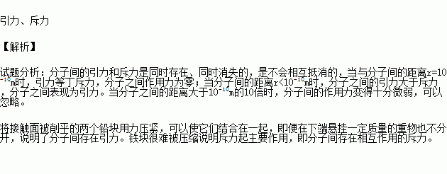 如图所示的演示实验中,是将接触面被削平的两个铅块用力压紧,可以使它们结合在一起,即使在下端悬挂一定质量的重物,铅块也不分开,此现象说明分子之间存在相互作用的_________,铁块很难被压缩,是因为分子之间存在相互作用的_________.