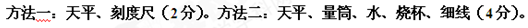 实验室里备有天平(含砝码)、刻度尺、量筒、空瓶、烧杯、水和细线,请你设计两种测定一个正方体小金属块的密度的方法(不需写方法),然后按方法要求从上面的器材中选择适当的器材填在对应的方法中。