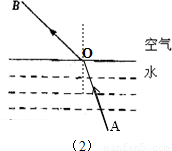 (2)先过折射点O垂直水面作出法线,在法线右侧的水中画出入射光线AO,方向指向入射点,注意入射角小于折射角,如图所示: