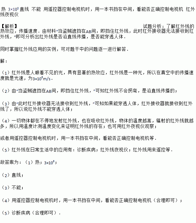热 3×108 直线 不能 用遥控器控制电视机时,用一本书挡在中间,看能否正确控制电视机 红外线夜视仪 【解析】试题分析:了解红外线的热效应,传播速度.由材料“当盗贼遮挡在AB间,即挡住红外线,此时红外接收器无法接收到红外线,”即可分析出红外线是否沿直线传播,是否能穿透人体. 同时掌握红外线应用的实例,可对题干中的问题逐一进行解答. 【解析】 (1)红外线是人眼看不见的光,...