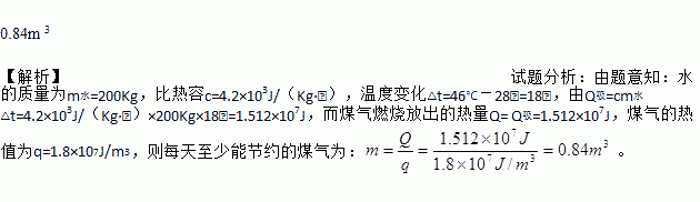 有一种太阳能热水器,在晴天气温为28℃时,每天可以将200Kg的水加热到46℃,那么每天至少能节约多少煤气?(煤气的热值为1.8×10 7 J/m 3 )