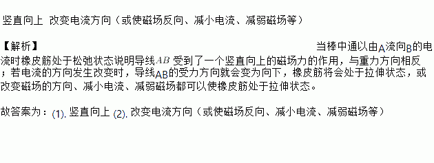 如图所示,用两根橡皮筋悬挂的均匀金属棒AB水平处于磁场.当棒通以由A向B的电流时,金属棒静止,橡皮筋刚好处于松弛状态(导线对金属棒的作用力忽略不计),此时金属棒受到的磁场力方向为__.若要使橡皮筋处于拉伸状态,在不人为对棒施力的条件下,请提出一项可行的措施_____.