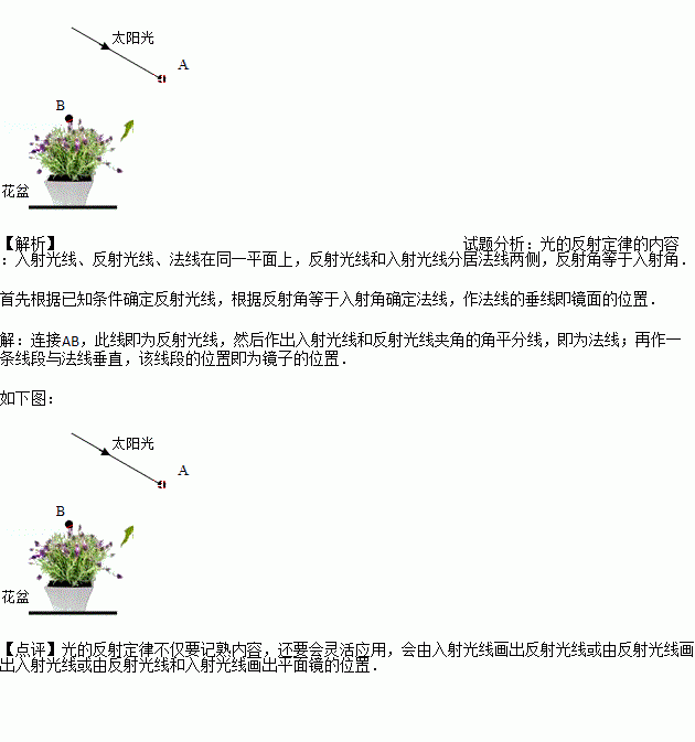 小宇的妈妈喜欢在家中养花,为了使客厅里花盆中的花能茁壮成长,小宇想让室外太阳光照射到盆中花上的B处,如图.请你在图中把光路补充完整并过A点画出放置的平面镜.