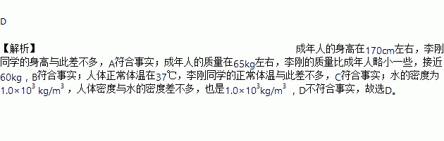 A. 身高约170 cm B. 质量约60 kg C. 体温约37℃ D. 密度约1.0×103 g/cm3