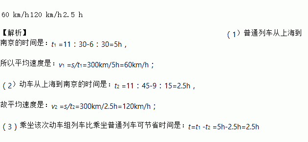 60 km/h 120 km/h 2.5 h 【解析】(1)普通列车从上海到南京的时间是:t1 =11:30-6:30=5h, 所以平均速度是:v1 =s/t1=300km/5h=60km/h; (2)动车从上海到南京的时间是:t2 =11:45-9:15=2.5h, 故平均速度是:v2 =s/t2=300km/2.5h=120km/h; (3)乘坐该次动车组列车比乘...