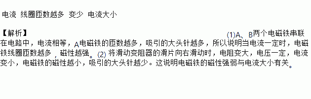 电流 线圈匝数越多 变少 电流大小 【解析】(1)A、B两个电磁铁串联在电路中,电流相等,A电磁铁的匝数越多,吸引的大头针越多,所以说明当电流一定时,电磁铁线圈匝数越多,磁性越强。(2) 将滑动变阻器的滑片向右滑动时,电阻变大,电压一定,电流变小,电磁铁的磁性越小,吸引的大头针越少。这说明电磁铁的磁性强弱与电流大小有关。