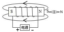 标出磁感线方向、小磁针的N极和电源的正、负极。