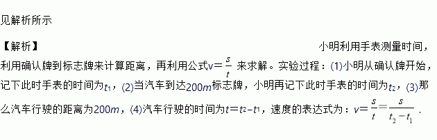 ¼û½âÎöËùʾ ¡¾½âÎö¡¿Ð¡Ã÷ÀûÓÃÊÖ±í²âÁ¿Ê±¼ä£¬ÀûÓÃÈ·ÈÏÅÆµ½±ê־ůÀ´¼ÆËã¾àÀ룬ÔÙÀûÓù«Ê½v£½À´Çó½â¡£ÊµÑé¹ý³Ì£º(1)СÃ÷´ÓÈ·ÈÏÅÆ¿ªÊ¼£¬¼ÇÏ´ËʱÊÖ±íµÄʱ¼äΪt1£¬(2)µ±Æû³µµ½´ï200m±ê־ů£¬Ð¡Ã÷ÔÙ¼ÇÏ´ËʱÊÖ±íµÄʱ¼äΪt2£¬(3)ÄÇôÆû³µÐÐÊ»µÄ¾àÀëΪ200m£¬(4)Æû³µÐÐÊ»µÄʱ¼äΪt£½t2?t1£¬Ëٶȵıí´ïʽΪ£ºv£½.