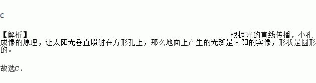 C 【解析】根据光的直线传播,小孔成像的原理,让太阳光垂直照射在方形孔上,那么地面上产生的光斑是太阳的实像,形状是圆形的。 故选C.