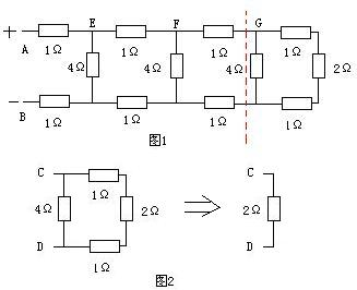 则CD两点间的等效电阻为:两个1Ω和2Ω串联后的电阻为4Ω,再与4Ω的电阻并联,得到的电阻为2Ω,