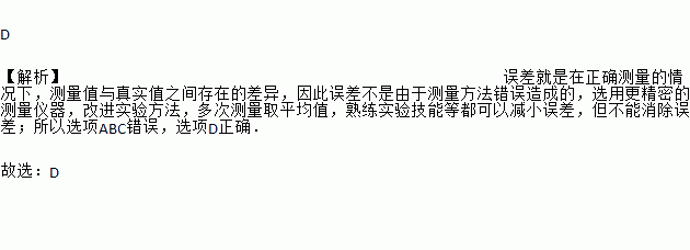 D 【解析】误差就是在正确测量的情况下,测量值与真实值之间存在的差异,因此误差不是由于测量方法错误造成的,选用更精密的测量仪器,改进实验方法,多次测量取平均值,熟练实验技能等都可以减小误差,但不能消除误差;所以选项ABC错误,选项D正确. 故选:D