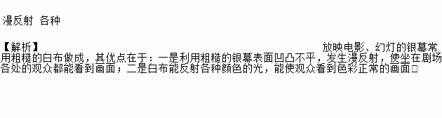 漫反射 各种 【解析】放映电影、幻灯的银幕常用粗糙的白布做成,其优点在于:一是利用粗糙的银幕表面凹凸不平,发生漫反射,使坐在剧场各处的观众都能看到画面;二是白布能反射各种颜色的光,能使观众看到色彩正常的画面。