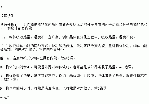 C 【解析】 试题分析:(1)内能是指物体内部所有做无规则运动的分子具有的分子动能和分子势能的总和,一切物体都有内能; (2)物体吸收热量,温度不一定升高,例如晶体在熔化过程中,吸收热量,温度不变; (3)改变物体内能的两种方式:做功和热传递;做功可以改变内能,且对物体做功,物体内能会增加,物体对外做功,物体内能会减小. 【解析】 A、温度为0℃的物体也具有内能,故...