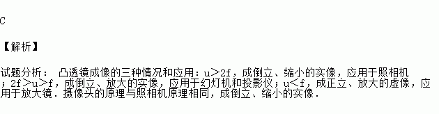 C 【解析】 试题分析: 凸透镜成像的三种情况和应用:u>2f,成倒立、缩小的实像,应用于照相机;2f>u>f,成倒立、放大的实像,应用于幻灯机和投影仪;u<f,成正立、放大的虚像,应用于放大镜.摄像头的原理与照相机原理相同,成倒立、缩小的实像.