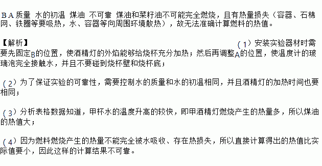 B A ÖÊÁ¿ Ë®µÄ³õΠúÓÍ ²»¿É¿¿ úÓͺͲË×ÑÓͲ»¿ÉÄÜÍêȫȼÉÕ£¬ÇÒÓÐÈÈÁ¿Ëðʧ£¨ÈÝÆ÷¡¢Ê¯ÃÞÍø¡¢ÌúȦµÈÒªÎüÈÈ£¬Ë®¡¢ÈÝÆ÷µÈÏòÖÜΧ»·¾³É¢ÈÈ£©£¬¹ÊÎÞ·¨×¼È·¼ÆËãȼÁϵÄÈÈÖµ¡£ ¡¾½âÎö¡¿£¨1£©°²×°ÊµÑéÆ÷²ÄʱÐèÒªÏȹ̶¨BµÄλÖã¬Ê¹¾Æ¾«µÆµÄÍâÑæÄܹ»¸øÉÕ±³ä·Ö¼ÓÈÈ£»È»ºóÔÙµ÷ÕûAµÄλÖã¬Ê¹Î¶ȼƵIJ£Á§ÅÝÍêÈ«½Ó´¥Ë®£¬²¢ÇÒ²»ÒªÅöµ½ÉÕ±±ÚºÍÉÕ±µ×£» £¨2£©ÎªÁ˱£Ö¤ÊµÑéµÄ¿É¿¿ÐÔ£¬ÐèÒª¿ØÖÆË®µÄÖÊÁ¿ºÍË®µÄ³õÎÂÏàͬ£¬²¢ÇÒ...