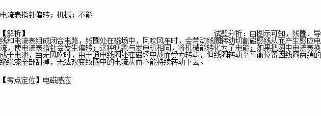 如图所示,用漆包线绕成矩形线圈,将线圈两端的导线拉直并用刀将漆全部刮掉,作为转动轴,将线圈放在金属支架上,在它下面放一块小磁体,用纸做一个小风车固定在转动轴上,将装置与小量程电流表相连,使小风车转动,可观察到 的现象,说明电路中有电流产生,此过程中 能转化为电能,若将电流表换成干电池接入电路,线圈 (选填“能”或“不能”)持续转动.