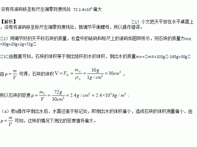 b.将石块放入装水的烧杯中,倒出超过标记处的水,并用胶头滴管调节使水面恰好在标记处,测出此时烧杯、水、石块全部的质量为145 g。
