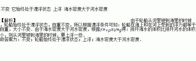 轮船从河里驶到海里的时候,船受到的浮力______,(选填“变大”、“变小”或“不变”)原因是_________;船身将______一些,原因是________________。