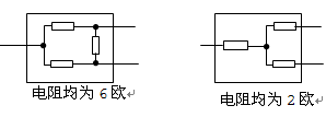 如图所示的盒子外有三根引线A、B、C。已知盒内是三个阻值相同的电阻连接而成,现利用伏安法测量后得知,任意两根引线的电阻的阻值为4欧,试在盒内画出电阻可能有的连接方式并确定电阻的阻值。