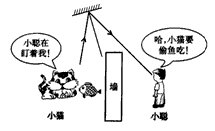 如图所示,小聪通过一平面镜看到小猫要偷吃小鱼。图中画出了入射光线和反射光线,但未标出光的传播方向。请你在图中用箭头标出小聪看到小猫偷鱼吃时的光的传播方向,并根据光的反射规律画出平面镜。