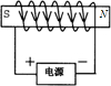 解:电源左侧为正极,右侧为负极;电源外部电流从正极流向负极,右手弯曲的四指与电流方向一致,垂直的大拇指指向螺线管右侧,右侧为N极,左侧为S极;如图: