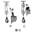 用四个相同的滑轮和两根相同的绳子组成如图11所示的甲、 乙两个滑轮组,用它们提起相同的货物,上升相同的高度。不计绳重和摩擦,则![]()