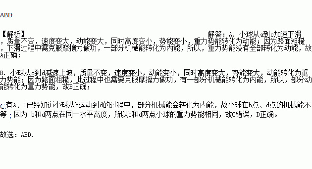 B. 小球从c到d减速上坡,部分动能转化为重力势能