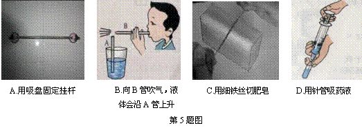 C、用细铁丝切肥皂,利用了减小受力面积,增大压强的方法,容易把肥皂切开,与大气压无关,符合题意;