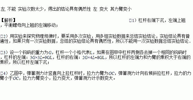 (3)如图(甲)所示,杠杆在水平位置平衡.如果在杠杆两侧各去掉一个相同的钩码,则杠杆____(填“左”或“右”)端将下沉.