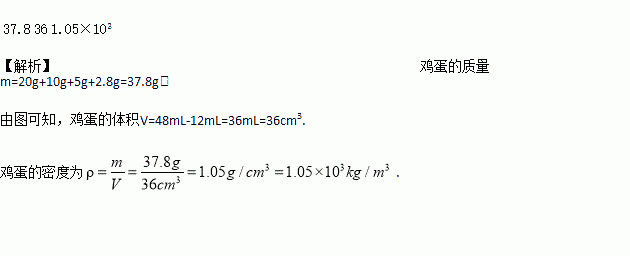 小欢在实验室测量一个鸡蛋的密度。首先她利用天平测鸡蛋的质量,测出结果如题图所示,鸡蛋的质量为_____g;再将鸡蛋用细线系好放进盛有水的量筒中,量筒中的水面升高,如题图所示,则鸡蛋的体积为________ cm3。鸡蛋的密度为__________kg/m3.