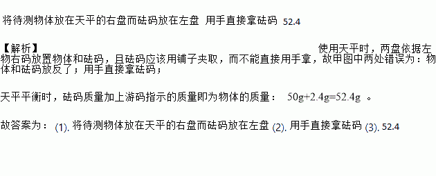 将待测物体放在天平的右盘而砝码放在左盘 用手直接拿砝码 52.4 【解析】使用天平时,两盘依据左物右码放置物体和砝码,且砝码应该用铺子夹取,而不能直接用手拿,故甲图中两处错误为:物体和砝码放反了;用手直接拿砝码; 天平平衡时,砝码质量加上游码指示的质量即为物体的质量: 。 故答案为: (1). 将待测物体放在天平的右盘而砝码放在左盘 (2). 用手直接拿砝码 (3). 52.4 ...