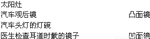 太阳灶是利用凹面镜把阳光会聚;汽车观后镜是利用凸面镜能扩大视野;汽车车灯的灯碗是利用凹面镜对光线的会聚作用;医生检查耳道时带的镜子也是利用凹面镜对光线的会聚作用,