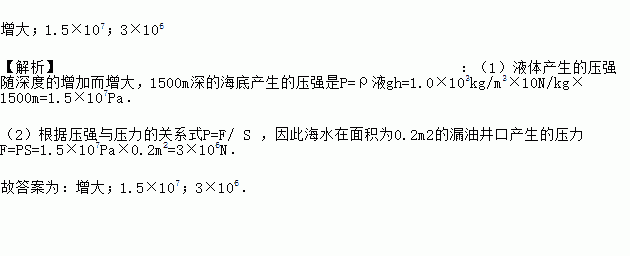 Ôö´ó£»1.5¡Á107£»3¡Á106 ¡¾½âÎö¡¿£º£¨1£©ÒºÌå²úÉúµÄÑ¹Ç¿ËæÉî¶ÈµÄÔö¼Ó¶øÔö´ó£¬1500mÉîµÄº£µ×²úÉúµÄѹǿÊÇP=¦ÑÒºgh=1.0¡Á103kg/m3¡Á10N/kg¡Á1500m=1.5¡Á107Pa£® £¨2£©¸ù¾ÝѹǿÓëѹÁ¦µÄ¹ØÏµÊ½P=F/ S £¬Òò´Ëº£Ë®ÔÚÃæ»ýΪ0.2m2µÄ©Ó;®¿Ú²úÉúµÄѹÁ¦F=PS=1.5¡Á107Pa¡Á0.2m2=3¡Á106N£® ¹Ê´ð°¸Îª£ºÔö´ó£»1.5¡Á107£»...