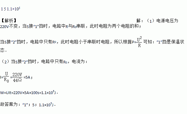 某电饭锅内有R0=44 Ω、R=2156 Ω的两根电热丝,将它接入电路,如图所示.当S分别置于“1”挡和“2”挡时,_______挡是保温状态;当S接“2”挡时,电路中的电流大小是_______A,通电100s电路产生的热量是_______J.