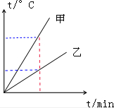 质量相等的甲、乙两种液体,温度相同、用两盏完全相同的酒精灯分别加热,记录的温度与时间变化的曲线如图,可知c甲________ c乙.(填>、<或=),原因是________.