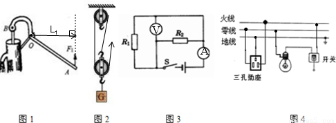 点评:此题考查杠杆的五要素,会画力臂,会根据力臂画出力.还考查了滑轮组的组装、电压表和电流表的判断、灯泡、开关、保险丝、三孔插座、两孔插座的连接方法等知识点,是一道综合性较强的题目.