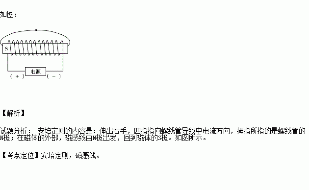 如图所示,请在图中标出电源的“+”、“ -”极,并用箭头标出磁感线的方向。