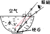 解答:解:当水倒到一定高度后,看到了硬币.产生这种现象的原因是由于从硬币发出的漫反射光经水面折射,折射光线远离法线向下偏折,当光线射入人眼,人凭光直线传播的感觉,认为硬币在折射光线的反向延长线上,其实人看到的是硬币的虚像S′.如图所示: