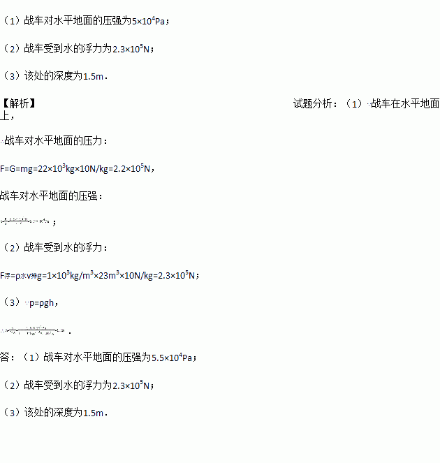 (3)在这次水上演习中,战车某处受到水的压强为1.5×104 Pa,则该处的深度为多少?