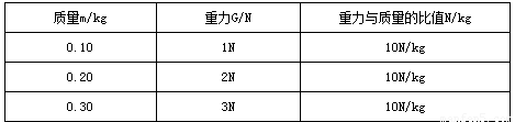 (1)从弹簧测力计所挂物体的质量从100g依次增大到200g、300g时,对应弹簧测力计的示数由1N依次变为2N和3N,说明当物体的质量成倍数的增大时,物体所受的重力也在成倍数的变化,即重力与质量成正比关系;由每一次的数据得出每一次重力与质量的比值是