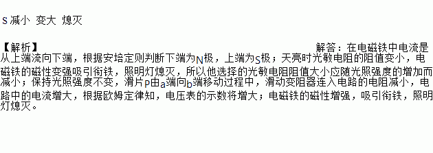 如图是设计师的一种“智能家居照明灯”,它在天暗时自动点亮,天亮时在自动熄灭,电磁铁的上端为 ________极,选用的光敏电阻阻值大小随光照强度的增强而________ ;保持光照强度不变,滑片P由a端向b端移动过程中,电压表的示数将________ (选填“变大”、“变小”或“不变”),照明灯将________ (选填“点亮”或“熄灭”).