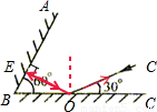 先画出法线,根据反射角等于入射角在法线左侧画出反射光线OE;反射角等于入射角为90°-30°=60°,反射光线OE与镜面BC的夹角为30°,而两镜面夹角为60°,由此可知反射光线OE垂直镜面AB入射,则光线OE被垂直反回,如图所示: