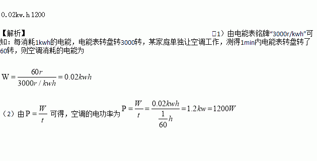 某家庭电能表如图丙所示。若该家庭单独让空调工作,测得1min内电能表转盘转了60转,则空调消耗的电能为____________,空调的电功率是__________W。
