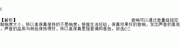 C 【解析】音响可以通过音量旋钮控制响度大小,所以高保真保持的不是响度;根据生活经验,保真效果好的音响,发出声音的高低,声音的品质与特色保持得好,所以高保真是指音调和音色,故选C。