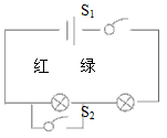 ,两灯都不亮;两个开关都闭合,只有绿灯亮。请在虚线框内画出它的电路图。