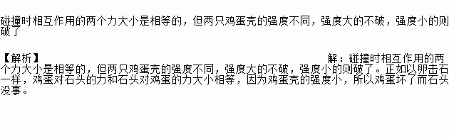 碰撞时相互作用的两个力大小是相等的,但两只鸡蛋壳的强度不同,强度大的不破,强度小的则破了 【解析】【解析】 碰撞时相互作用的两个力大小是相等的,但两只鸡蛋壳的强度不同,强度大的不破,强度小的则破了。正如以卵击石一样,鸡蛋对石头的力和石头对鸡蛋的力大小相等,因为鸡蛋壳的强度小,所以鸡蛋坏了而石头没事。