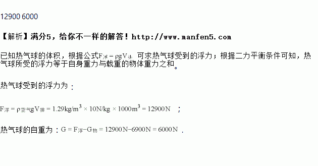 某热气球体积为1000m3 , 能载重6900N,若空气密度ρ=1.29kg/m3 , 则热气球受到的浮力为________ N,它的自重为________ N.(g取10N/kg)