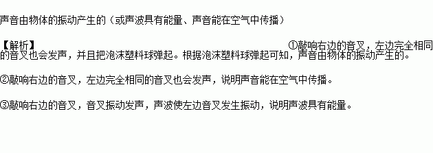 如图所示,敲响右边的音叉,左边完全相同的音叉也会发声,并且把泡沫塑料球弹起.该实验能说明哪些问题?请你写出两个: