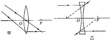 乙图中,一条光线平行于主光轴,则平行于主光轴的光线经凹透镜折射后,其折射光线的反向延长线过焦点;另一条光线延长线过另一侧焦点,则这条光线经凹透镜折射后将平行于主光轴,如下图所示: